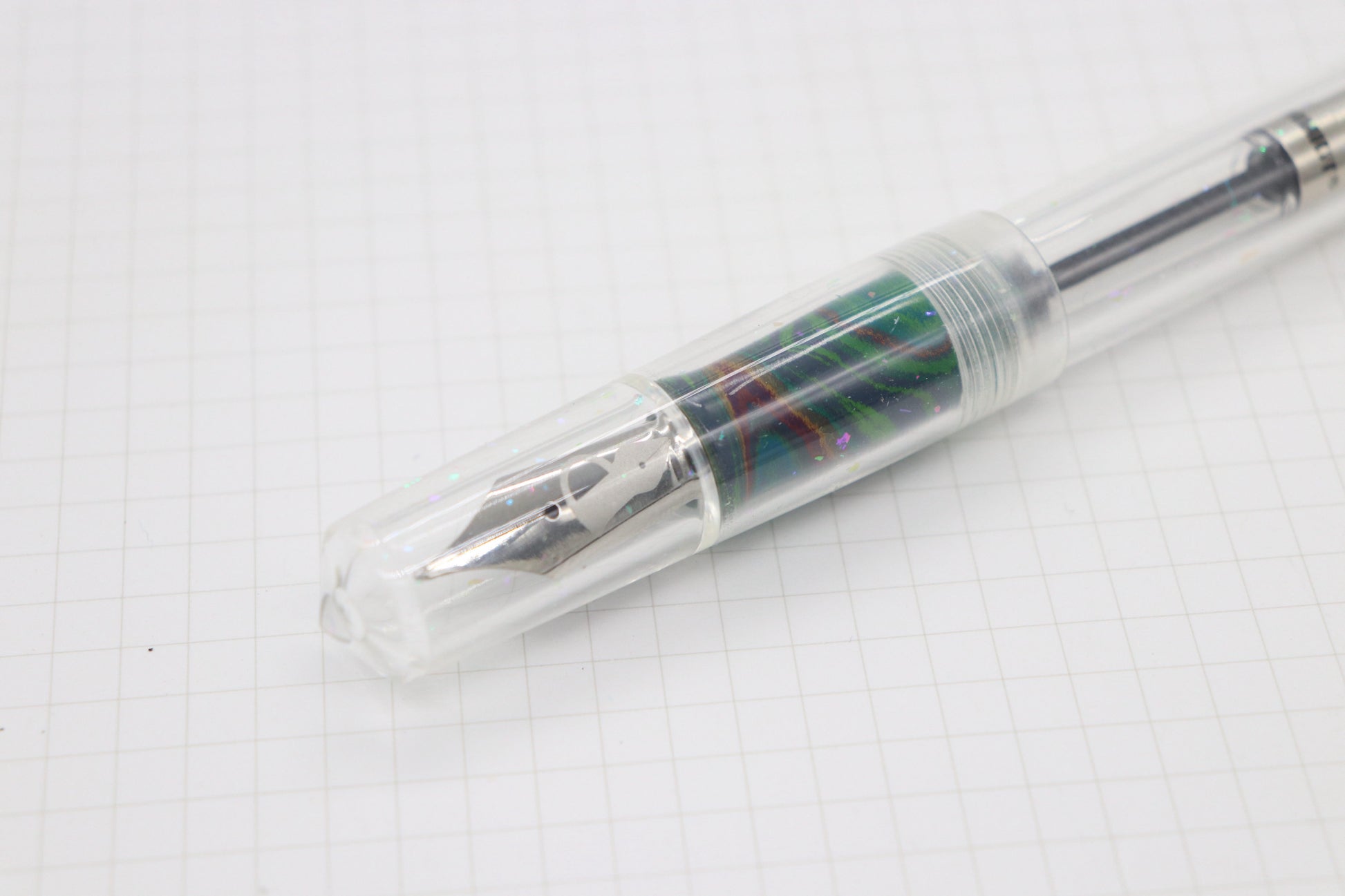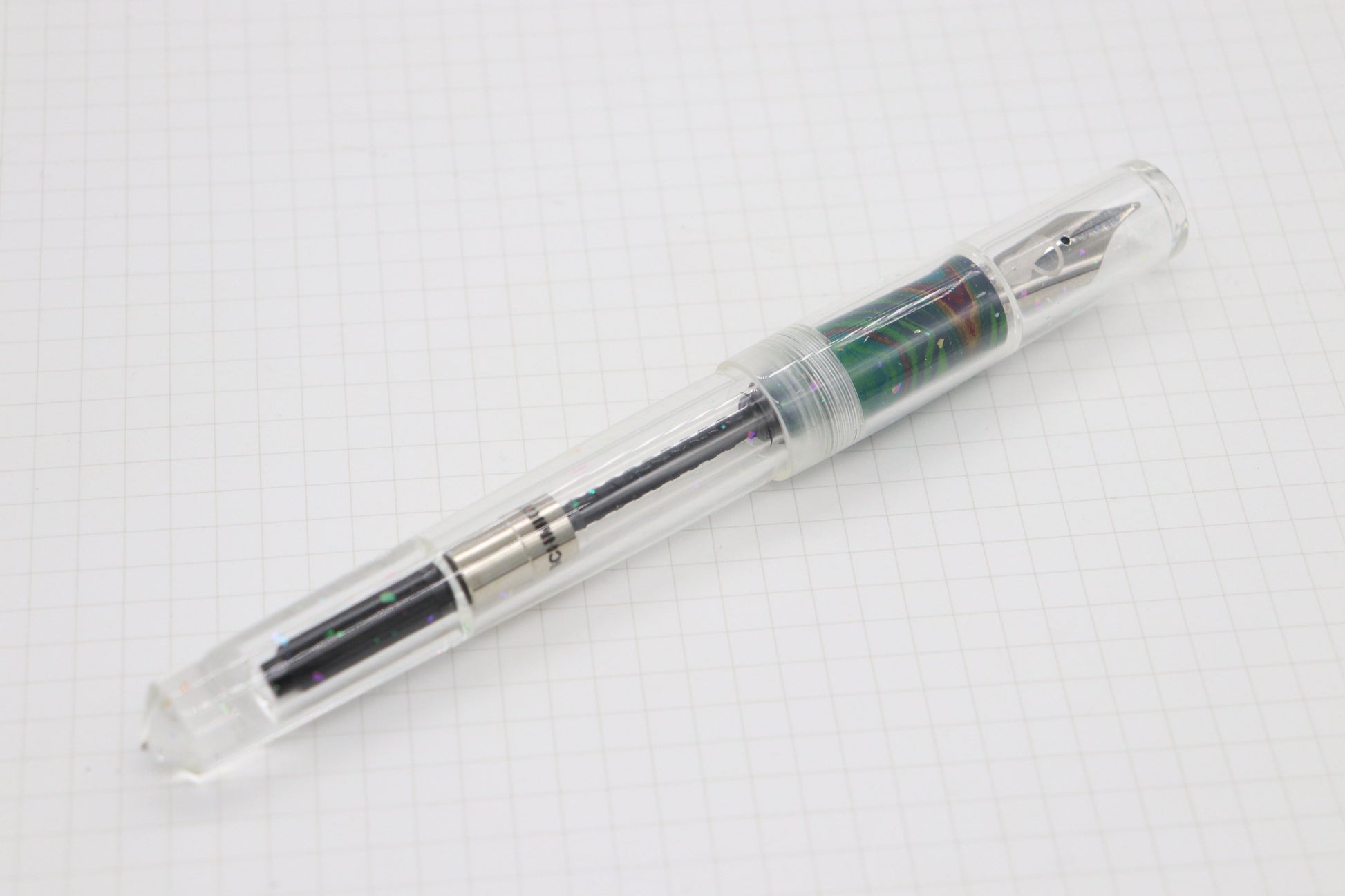 This pen was made with an in house clear sparkly material, and the grip section was made with SEM Ebonite 'Rainbow'